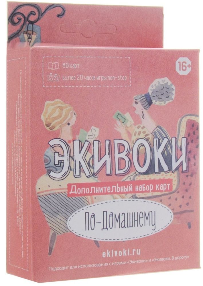 «Еківоки: По – Домашньому» це додатковий набір тематичних карт до популярної гри для вечірок – Еківоки . У цьому доповненні ви знайдете велику кількість слів і фраз що стосуються дому та сім’ї. Процес гри ні крапельки не змінився. Гравці діляться на команди, а потім ведучий гравець команди бере картку, кидає кубик і відповідно до його значенням визначає яким способом йому слід пояснити те чи інше слово або фразу. А пояснювати можна і піснями і малюнками і жестами. А ще є варіант прочитати слово навпаки або виліпити його значення з пластиліну. Ось, наприклад, уявіть як заспівати пісню про фразу «дати лапу» або намалювати «матріархат». Ми впевнені, ви вже посміхаєтеся, але ж гра навіть ще не почалася! Так що не втрачайте часу, а скоріше кличте друзів, розкладайте гру і готуйтеся до веселощів. Звертаємо вашу увагу на те, що «Еківоки По – Домашньому» це доповнення, і для повноцінної гри вам знадобиться базова версія гри «Еківоки».