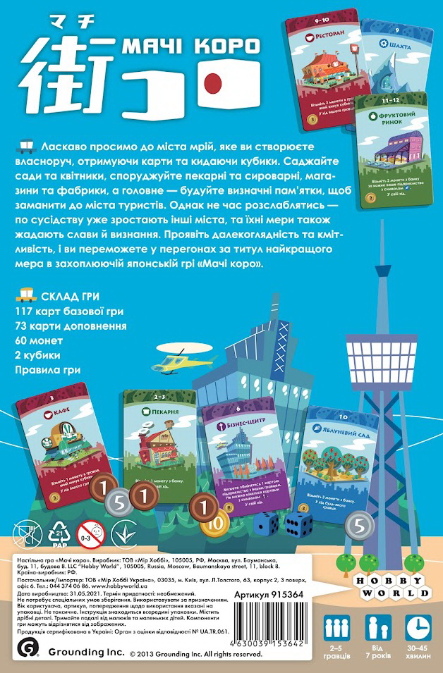 У настільної гри Мачі Коро (Machi Koro) гравці виступають в ролі проєктувальників невеликих містечок. Купуючи та розігруючи картки будівель, вони будуть поступово отримувати нові можливості й збільшувати власний добробут. Зведені споруди приносять прибуток, час отримання і розмір якої визначаються кидками кубиків. Є будівлі які дають прибуток тільки у свій хід, а є і такі, які працюють постійно. Деякі споруди впливають на продуктивність інших будівель, а деякі – дозволяють виконувати спеціальні дії. Загалом комбінацій в грі є безліч, і нудьгувати гравцям не доведеться. Крім цього в російській версії гри ви відразу знайдете додаток Мачі Коро Плюс, який дає доступ до великої кількості будівель з більш складними та цікавими ефектами.Комплектація гри Мачі Коро українською: