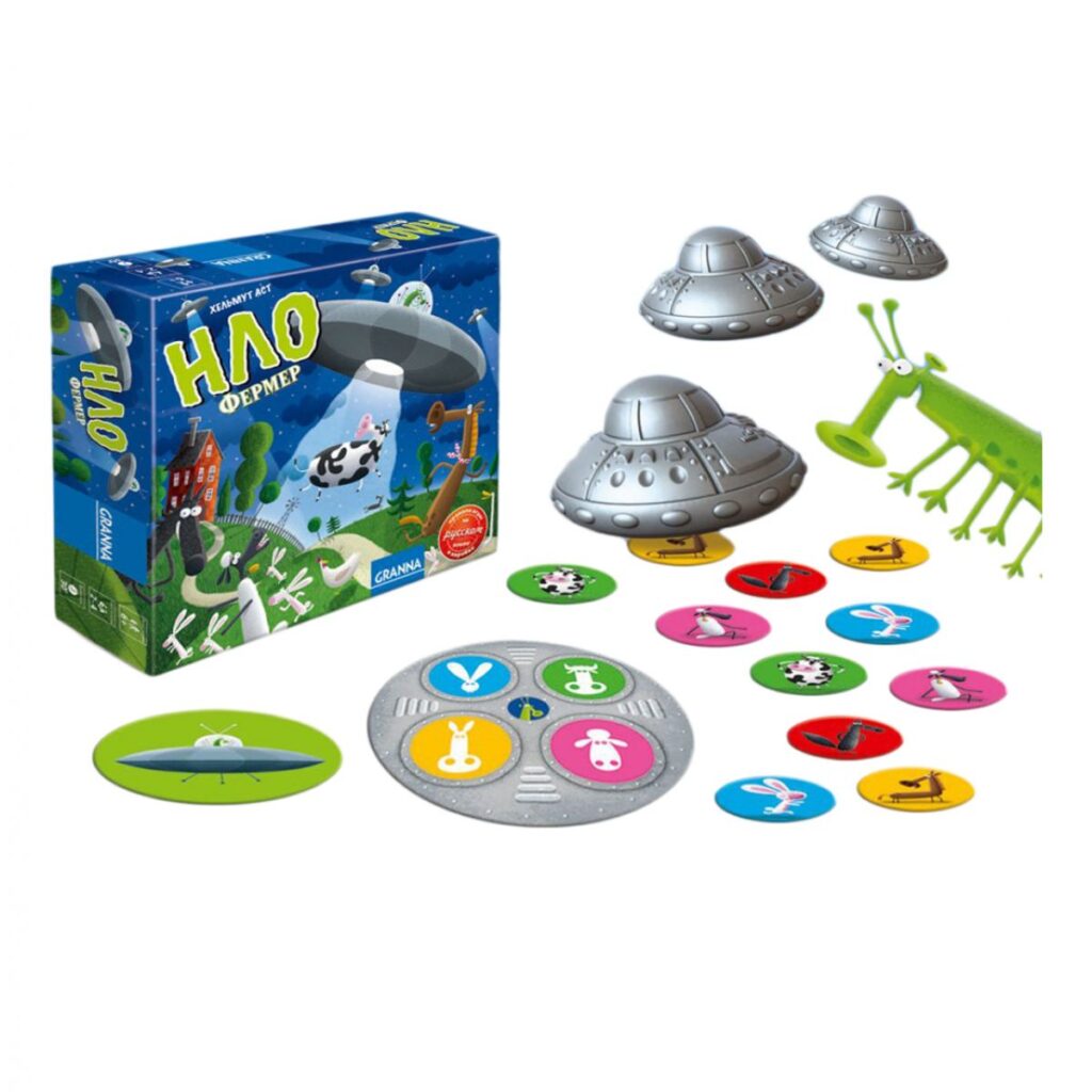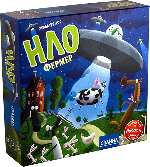 НЛО Фермер – чудова гра від польського видавництва Granna. На цей раз кожен з учасників стане прибульцем і буде забирати худобу з пасовищ до своїх космічних апаратів. Як і будь-яка таємна операція подібного масштабу, вилучення земних істот повинно проходити вночі, без свідків, після розвідки місцевості та належного планування. Це означає, що необхідно запам’ятати – де яка тварина знаходиться, і забрати на свою базу необхідні літаючі тарілки. У метушні, безперечно, виникне величезна плутанина, яка сильно ускладнить завдання гравців.