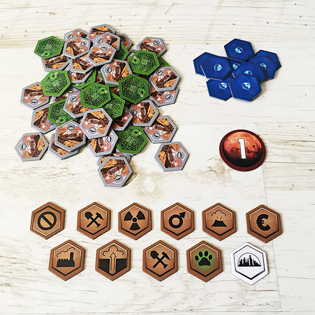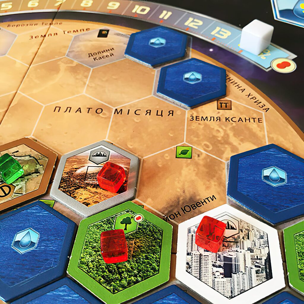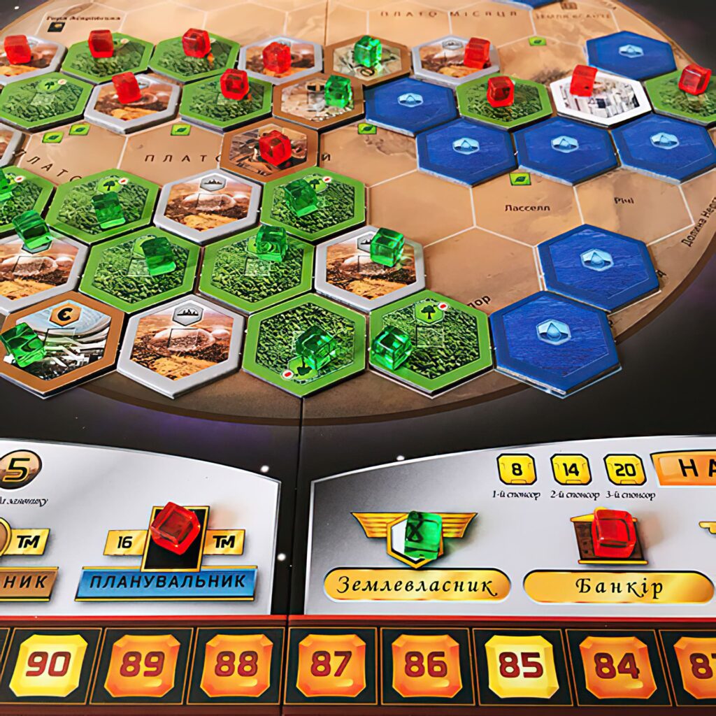 Тераформування Марса – це настільна гра, родзинку якій надає величезне розмаїття різних торгових і виробничих ланцюжків. У комплекті з грою йде більше 200 карт технологій, наукових досягнень, пригод і ресурсів, які можуть взаємодіяти між собою безліччю різних способів. По ходу гри поверхня Марса буде активно видозмінюватися. У колись безкрайній пустелі виростуть дерева, з’являться великі і малі водойми, почне зароджуватися життя.
