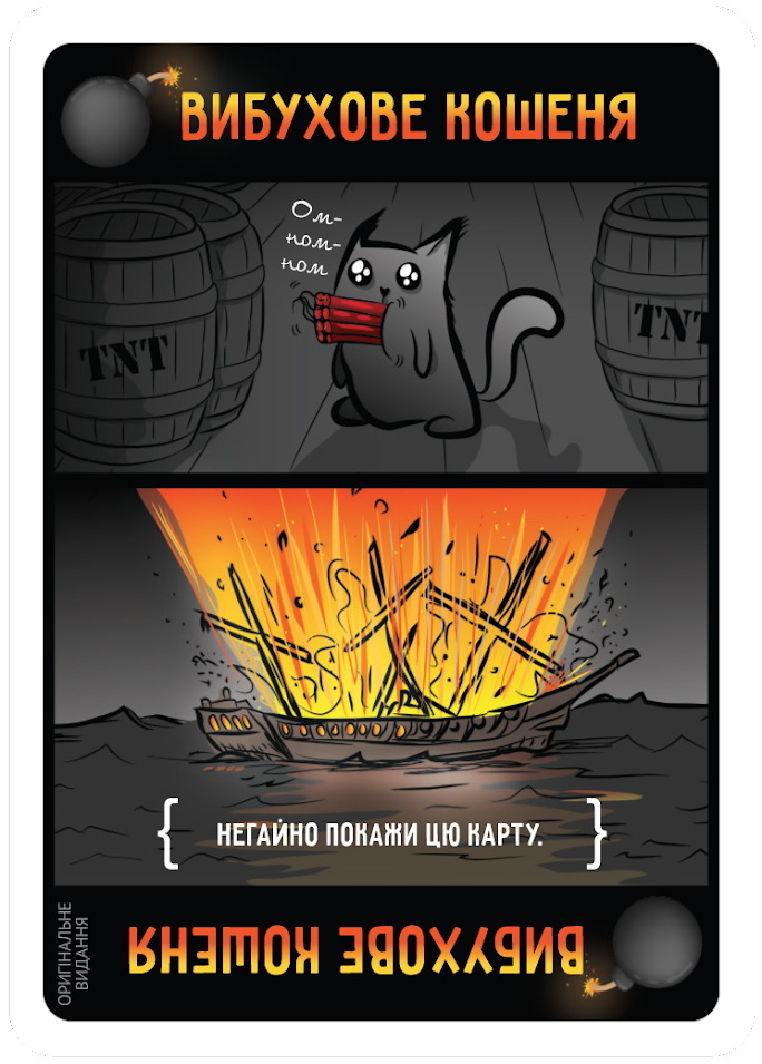 Вибухові кошенята – це весела гра для практично будь-якої компанії, яка змусить вас полоскотати нерви. Адже саме в ваших руках в будь-який момент може вибухнути кошеня і тоді прости-прощай, але вам доведеться покинути ігровий стіл.