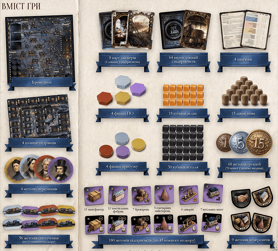 До складу настільної гри «Brass: Бірмінгем UA (Brass: Birmingham)» входить: