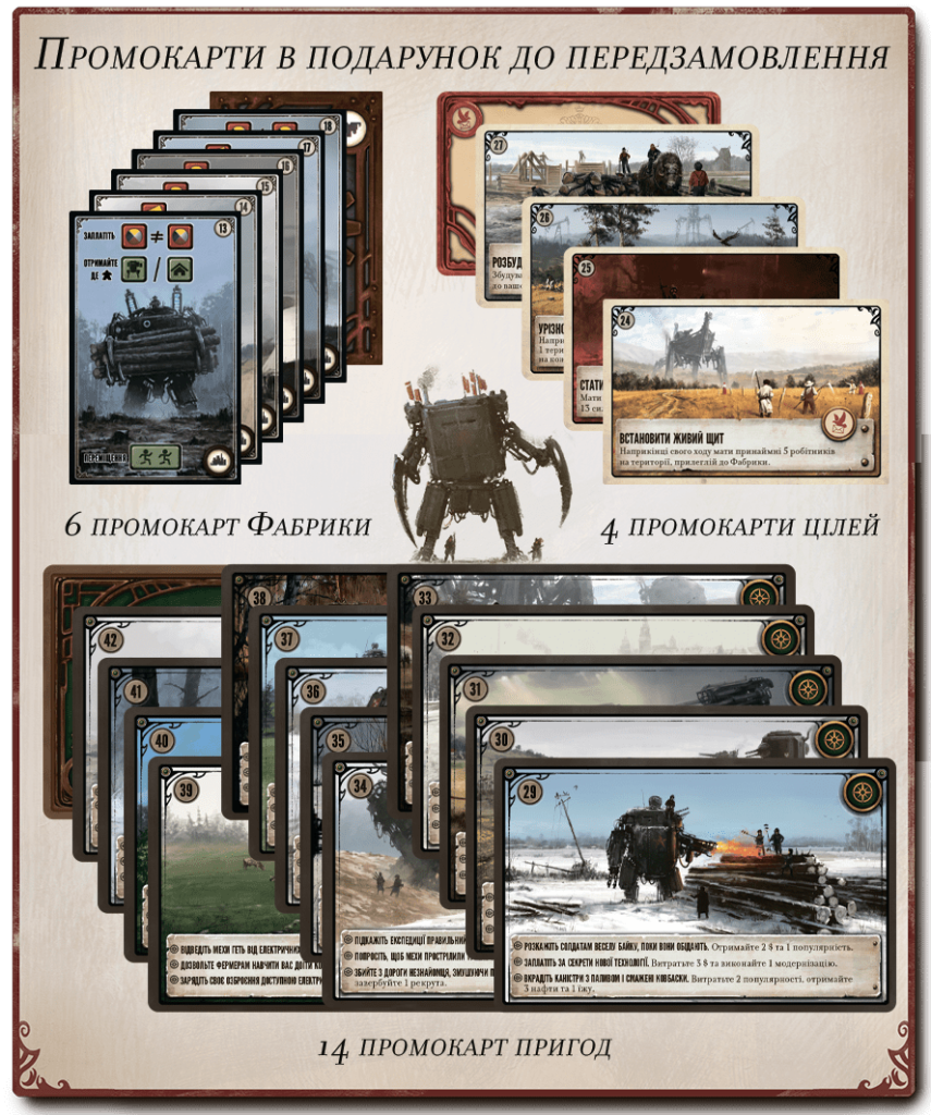 Про що гра? Уявіть собі альтернативні 20ті роки минулого століття. Закінчилася війна, що дала поштовх для розвитку техніки. Та окрім гігантських бойових роботів, вона принесла розруху та поразку усім сторонам конфлікту. На уламках цивілізації кожен з учасників починає створювати власну імперію, та намагається привести свій народ до процвітання. Я і у всіх євроґеймах, потрібно створювати та оптимізувати найефективніший механізм видобутку ресурсів та подальшого перетворення їх на переможні бали. Проте у вас є герой, котрій здатен подорожувати світом, збирати крихти втрачених технологій. Та гігантські бойові роботи, котрі можуть забезпечити контроль над певними територіями з корисними копалинами. Вам потрібно уважно слідкувати за власною репутацією серед мирних жителів на території сусідніх держав. Охороняти виходи з таємних підземних тунелів, бо інакше у вас в тилу зненацька може опинитися ворожа армія. Ну і звісно ж, спробуйте захопити та втримати фабрику, котра принесе вам не тільки додаткові переможні бали, а й круті бонуси.