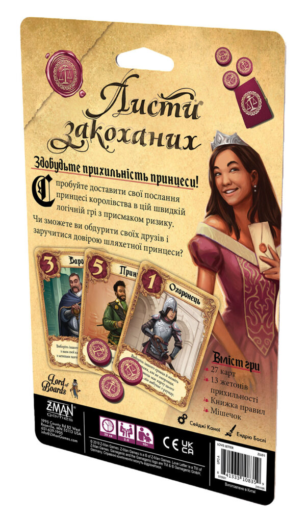 У грі використовується лише шістнадцять карт із зображеннями персонажів, що мешкають в палаці. Число на карі характеризує вплив персонажа — що більший, то більше шансів, що саме цей персонаж принесе перемогу, передавши послання сумній принцесі. На картах персонажів також указані унікальні здібності, які стануть у пригоді під час гри.