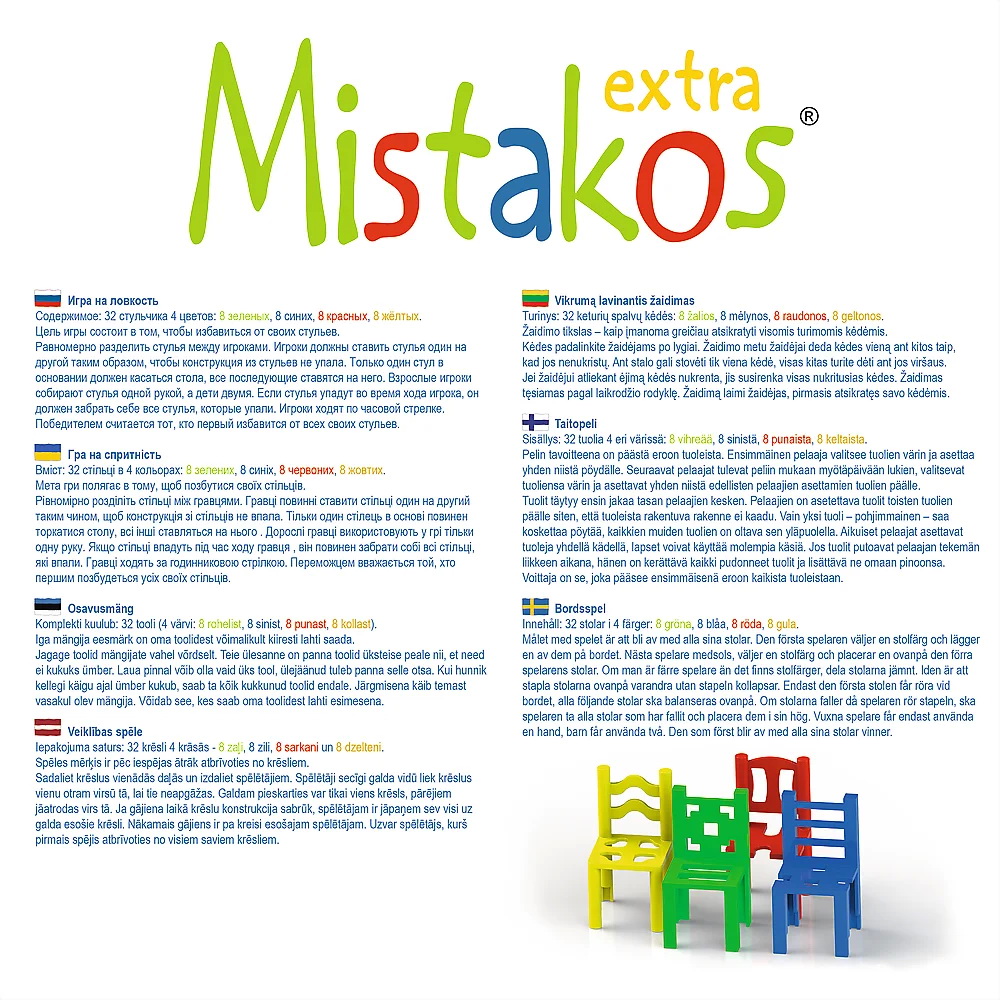 Мова: мовонезалежнаMistakos Extra – це нова версія сімейної гри про створення вежі з пластикових стільчиків. Тепер набір містить 8 додаткових жовтих стільчиків, за допомогою яких можна спорудити ще більш високу конструкцію! Чудово розвиває навички концентрації та спритності.