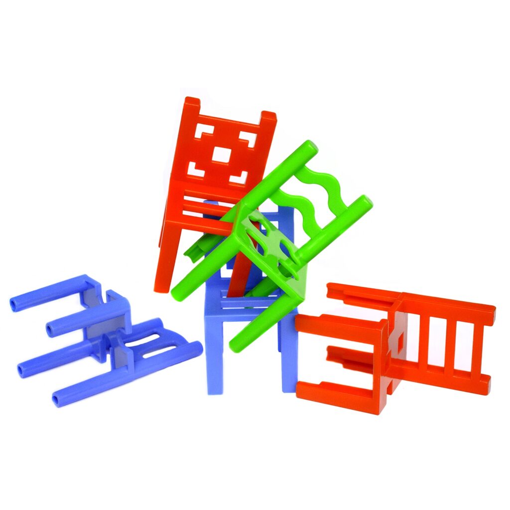 У комплекті ви знайдете 24 стільчика трьох кольорів – синього, червоного та зеленого. Крім того, всі вони різні. Мабуть сидіння і спинки створювалися дизайнерами меблів для кількох комплектів. Але вам це точно стати в нагоді, адже розташовані на різних місцях отвори дозволять успішно приєднувати стільчики один до одного. Завдяки такому виду стільчики легко чіпляються один одного ніжками і спинками, тому будуть триматися міцніше, а вежу можна буде будувати не тільки вгору, але і в широчінь.