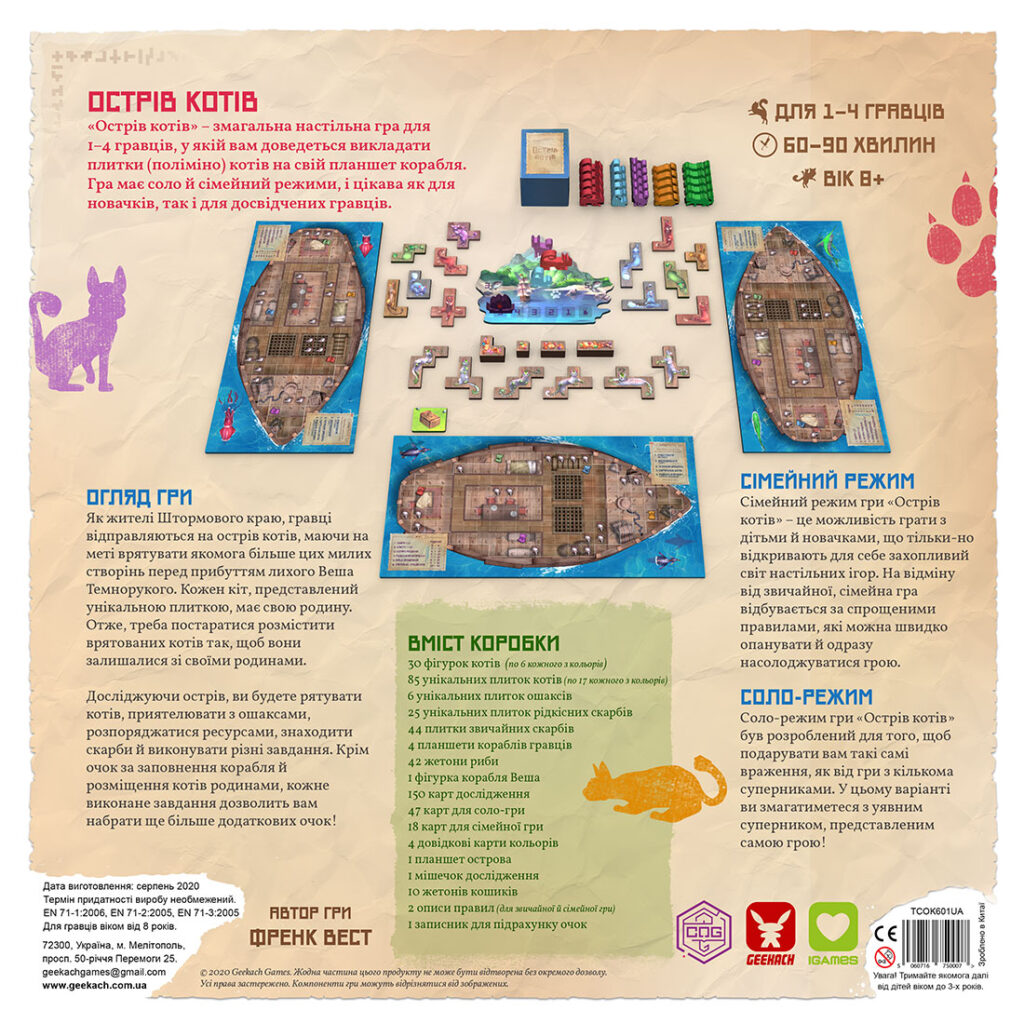 Це розумна тетрісоподібна настілка з механіками тайловикладання, драфту та збирання наборів. Естетів порадує яскравий, прикольний арт і красиві компоненти. Гра сподобається і дітям, і дорослим. Вона ідеально пасуватиме для сімейних або дружніх посиденьок. «Острів котів» також прекрасно грається соло.