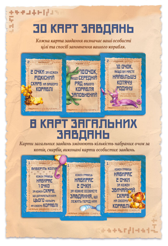 Куплені карти особистих завдань гравці викладають перед собою долілиць, а загальні завдання – горілиць.