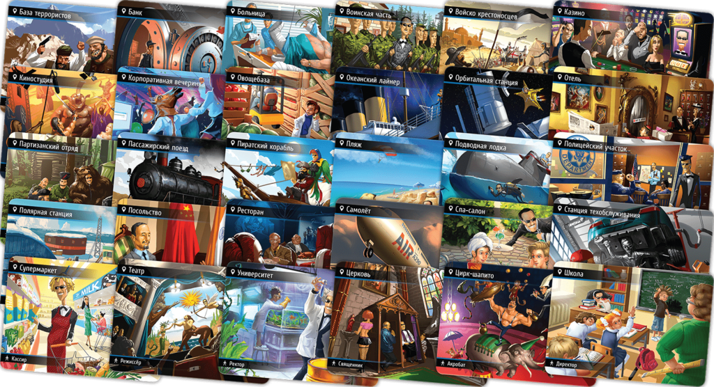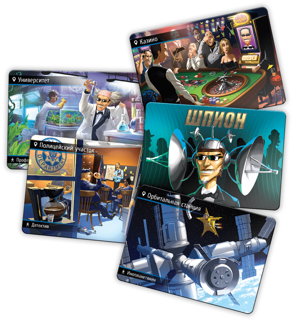 Шпигунська карта дістається тільки одному гравцеві, інші ж отримують карти з місцем, в якому відбуваються події. Це може бути орбітальна станція, овочева база, пасажирський поїзд, ресторан або будь-яка інша локація (всього їх є 30).